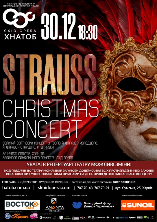 On Thursday, December 30, 2021, at 18.30, on the Grand Stage of the Kharkiv National Academic Opera and Ballet Theatre named after M.V. Lysenko the “STRAUSS CHRISTMAS CONCERT” will be held.