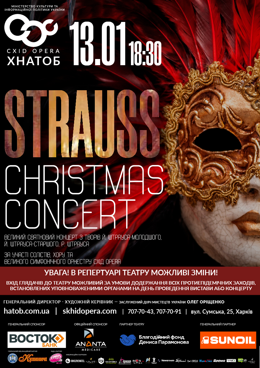 On Thursday, January 13, 2022, at 18.30, on the Grand Stage of the Kharkiv National Academic Opera and Ballet Theatre named after M.V. Lysenko the “STRAUSS CHRISTMAS CONCERT” will be held.