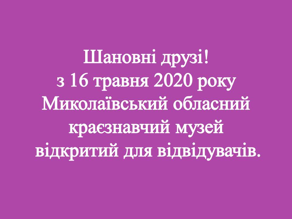 Шановні миколаївці, у зв`язку з послабленням карантинних заходів з 16.05.2020 Миколаївський обласний краєзнавчий музей працює в звичайному режимі (усі дні тижня, крім п’ятниці з 10-00 до 18-00) та є доступним для відвідувачів. До завершення карантину діють обмеження щодо кількості екскурсантів у одній групі, не більше 5-ти осіб. Умовою відвідування музею є наявність маски та відсутність симптомів ОРВІ. Музей, з свого боку, буде робить усе для безпечного відвідування.