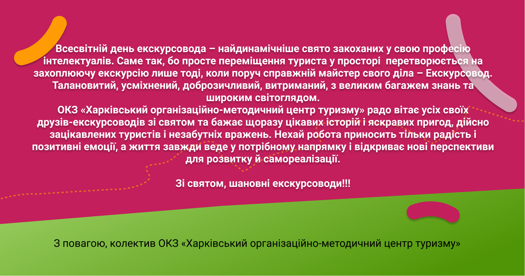 ОКЗ «Харківський організаційно-методичний центр туризму» радо вітає усіх своїх друзів-екскурсоводів зі святом та бажає щоразу цікавих історій і яскравих пригод, дійсно зацікавлених туристів і незабутніх вражень. Нехай робота приносить тільки радість і позитивні емоції, а життя завжди веде у потрібному напрямку і відкриває нові перспективи для розвитку й самореалізації.