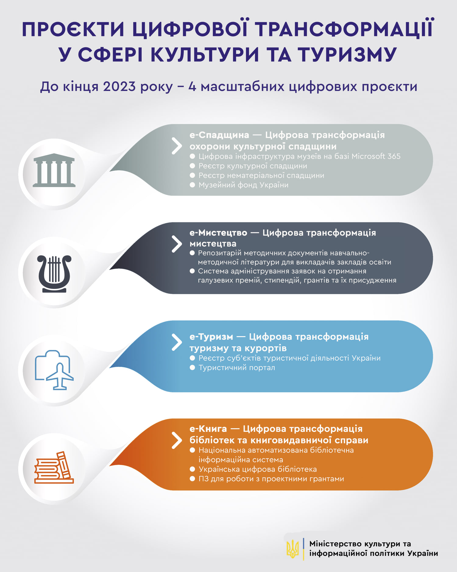 Як повідомив заступник Міністра культури та інформаційної політики з питань цифрового розвитку, цифрових трансформацій та цифровізації Артем Льозін, до кінця 2023 року має бути реалізовано 4 масштабних цифрових проєкти: