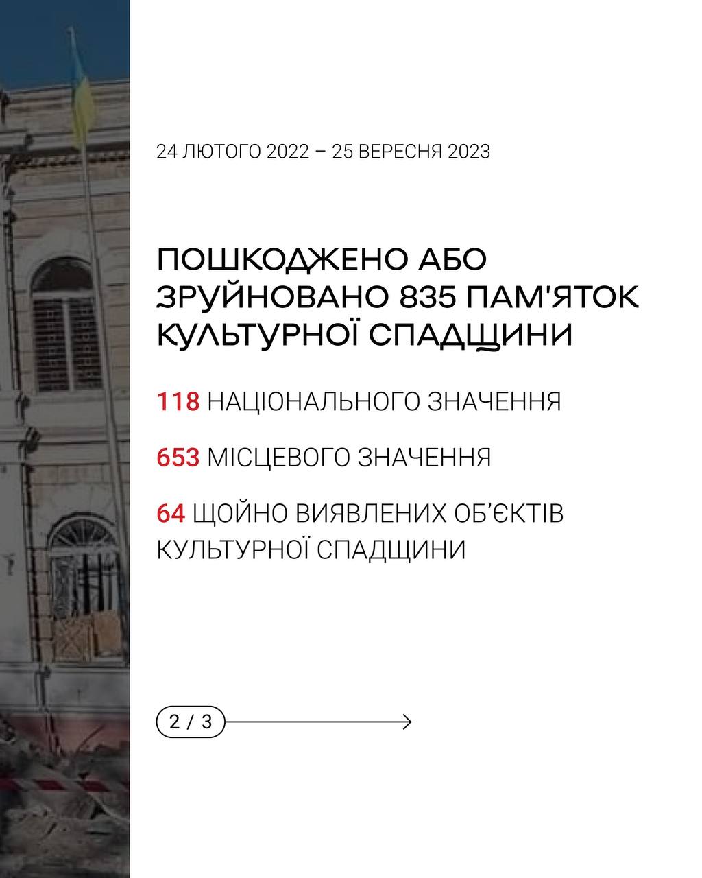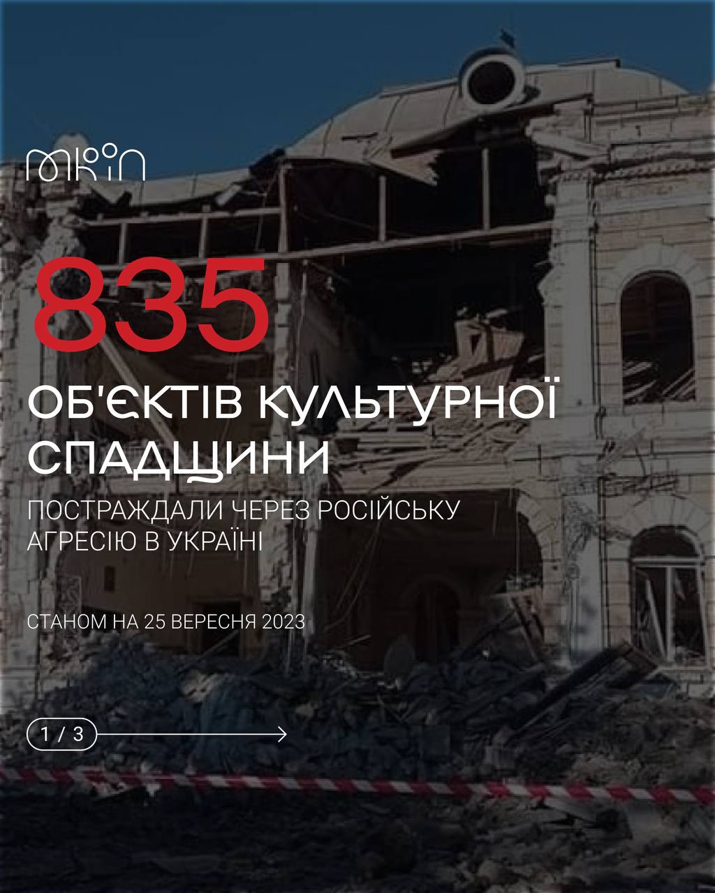 Міністерство культури та інформаційної політики України продовжує фіксувати пошкодження пам’яток культурної спадщини в Україні внаслідок російської агресії. За період з 24 лютого 2022 року по 25 вересня 2023 року зруйновано або пошкоджено 835 об’єктів культурної спадщини.