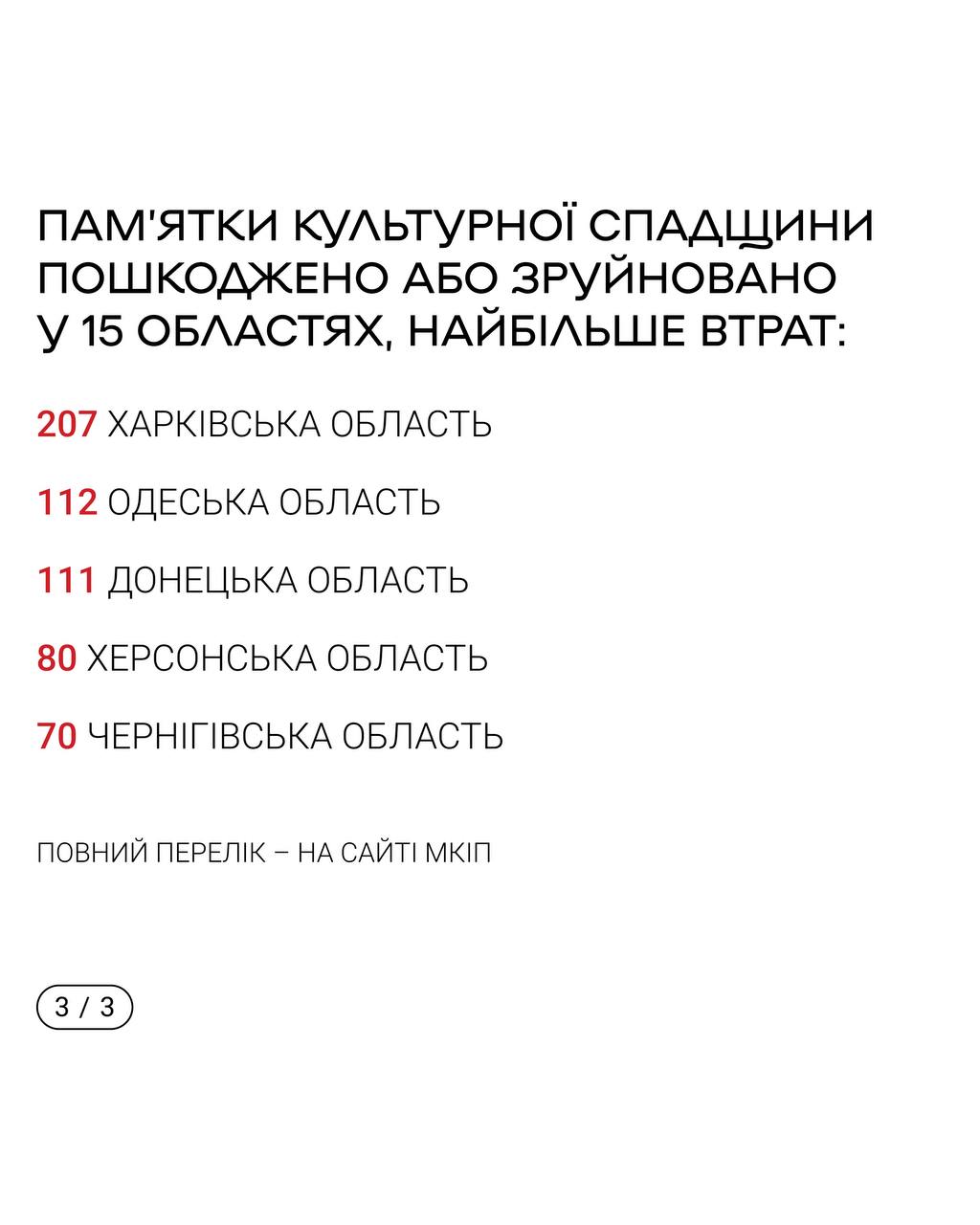 - Харківська область – 207 пошкоджених чи зруйнованих пам’яток культурної спадщини (Богодухівський район – 4; Ізюмський – 14; Красноградський – 2; Лозівський – 1; Харківський – 172; Чугуївський – 14). У тому числі 10 національного значення, 193 місцевого значення, 4 щойно виявлених об’єктів культурної спадщини.