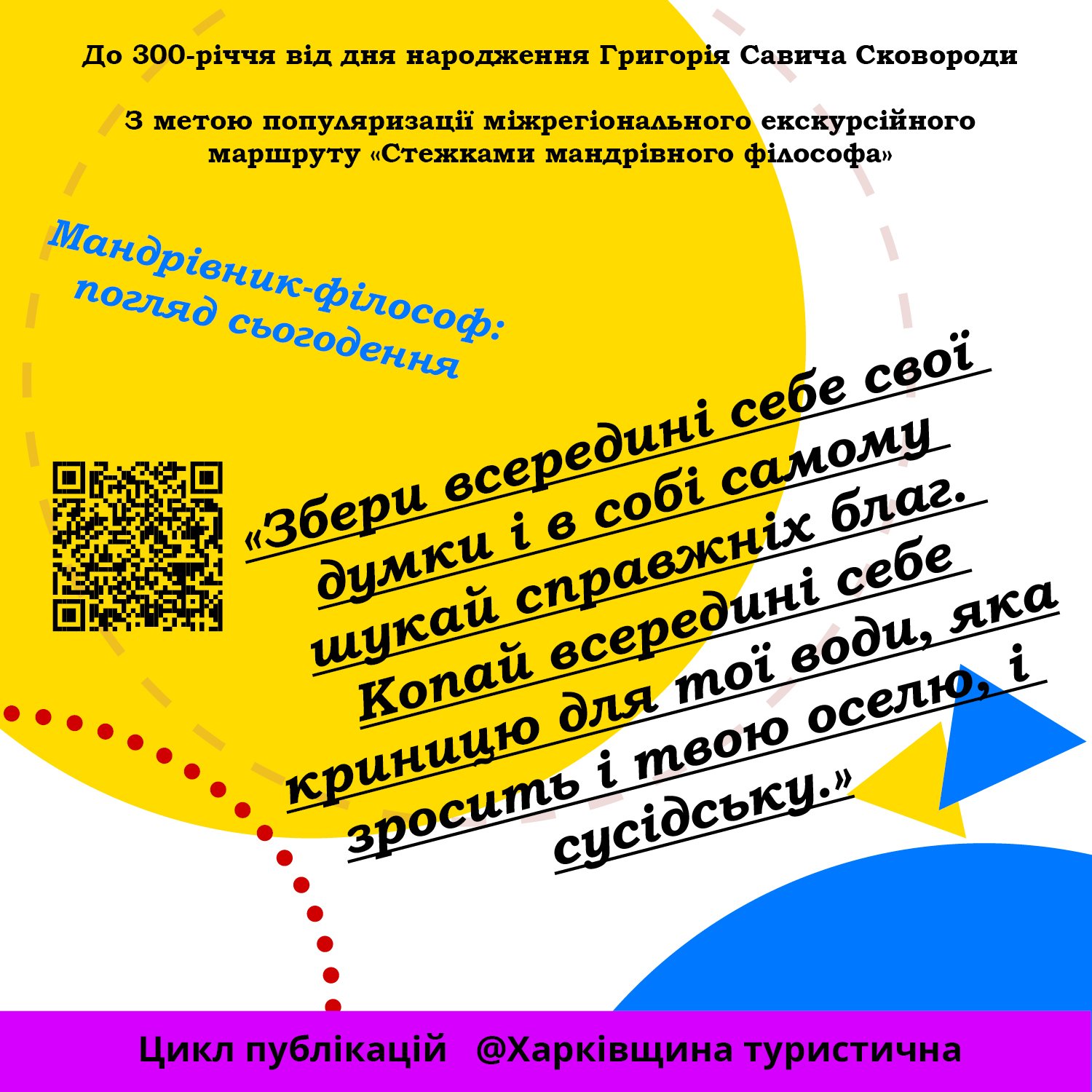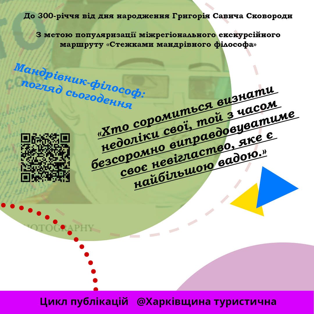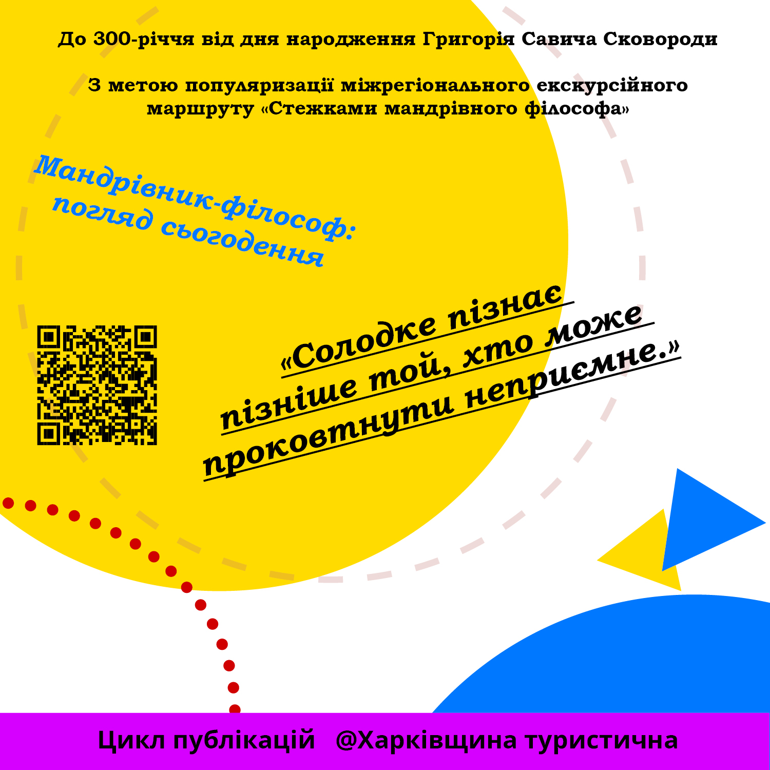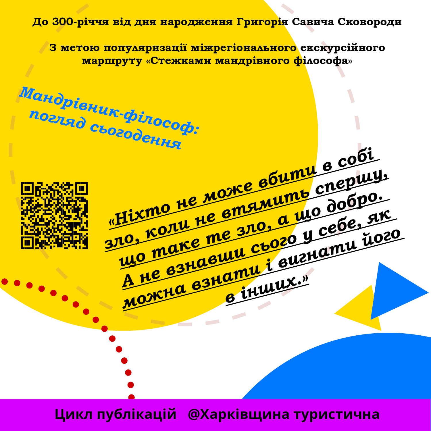 Висловами Сковороди та згадками про об'єкти з маршруту «Стежками мандрівного філософа», які ми ацентуємо вже сьогодні на ілюстраціях, спонукаємо всіх до роздумів. Адже кожен мандрівник в душі – філософ.