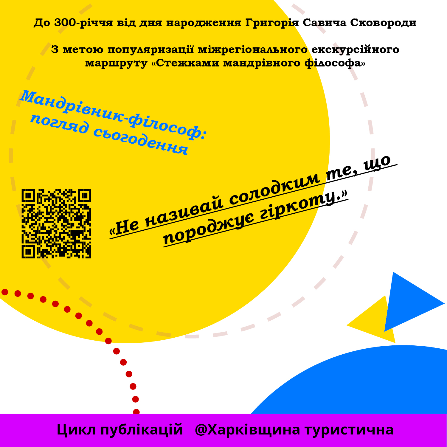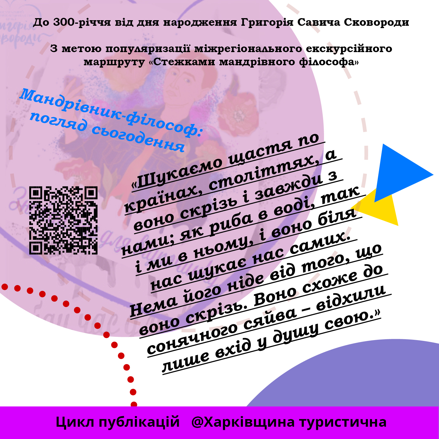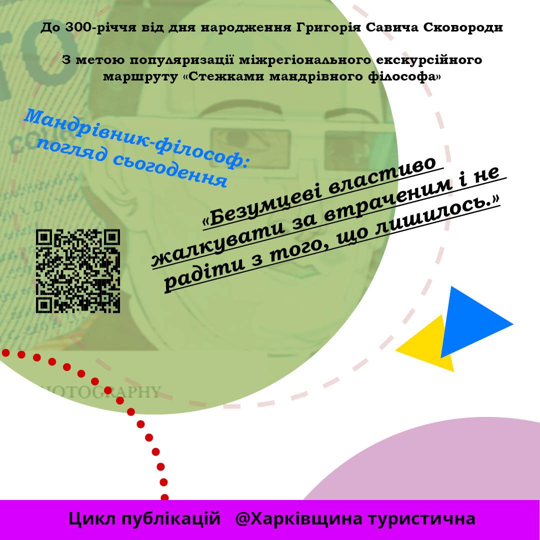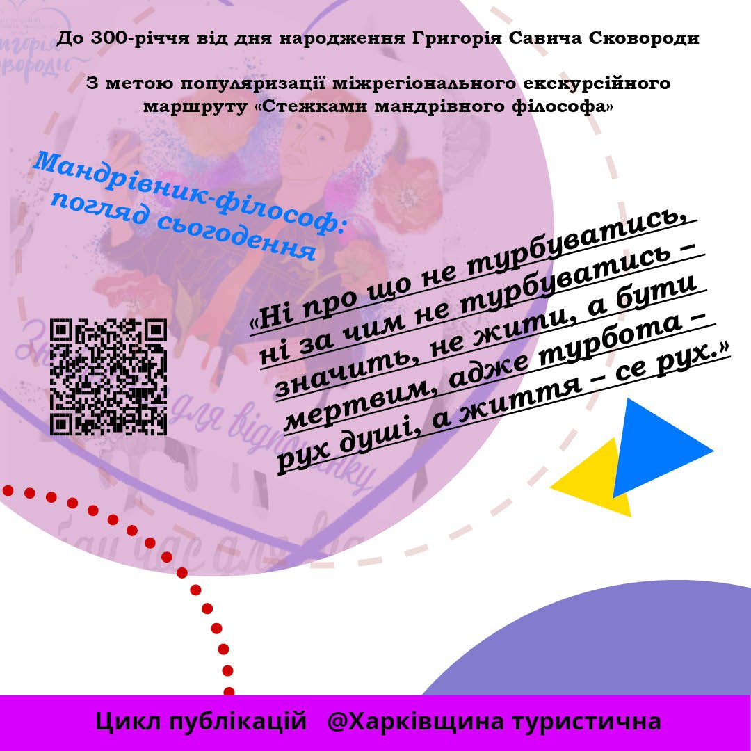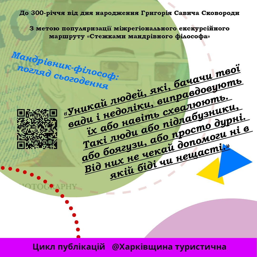 Висловами Сковороди та згадками про об'єкти з маршруту «Стежками мандрівного філософа», які ми ацентуємо вже сьогодні на ілюстраціях, спонукаємо всіх до роздумів. Адже кожен мандрівник в душі – філософ.