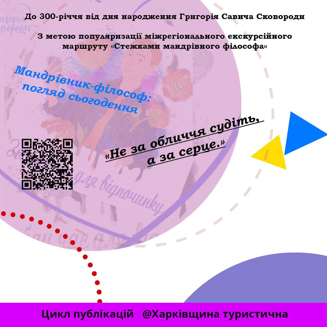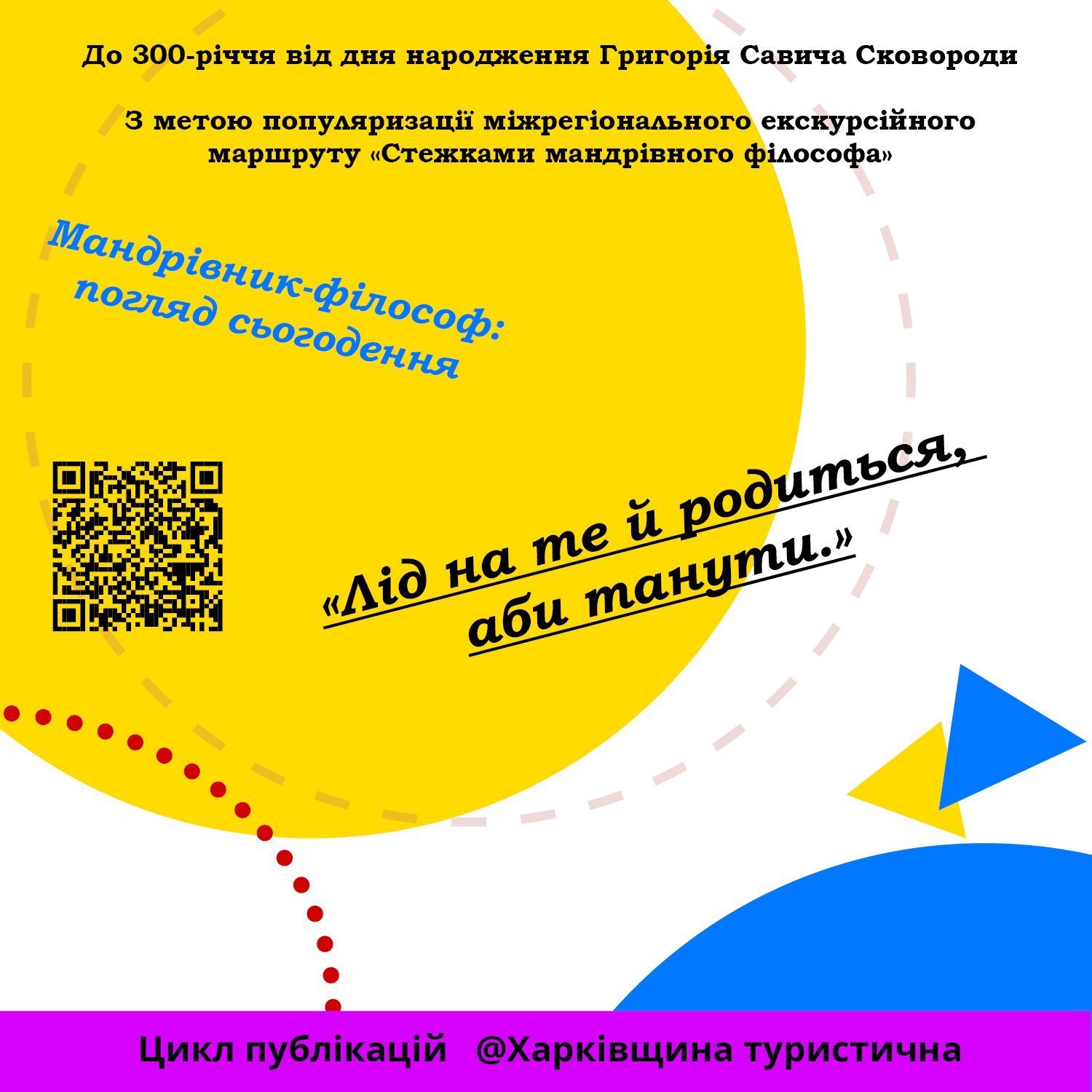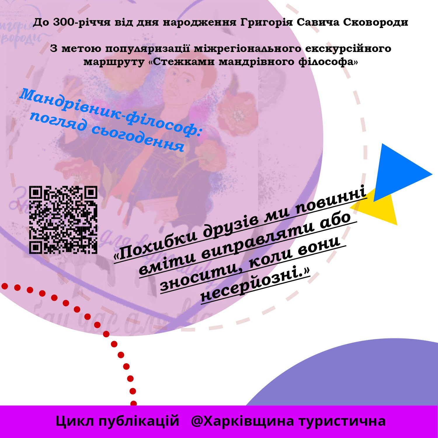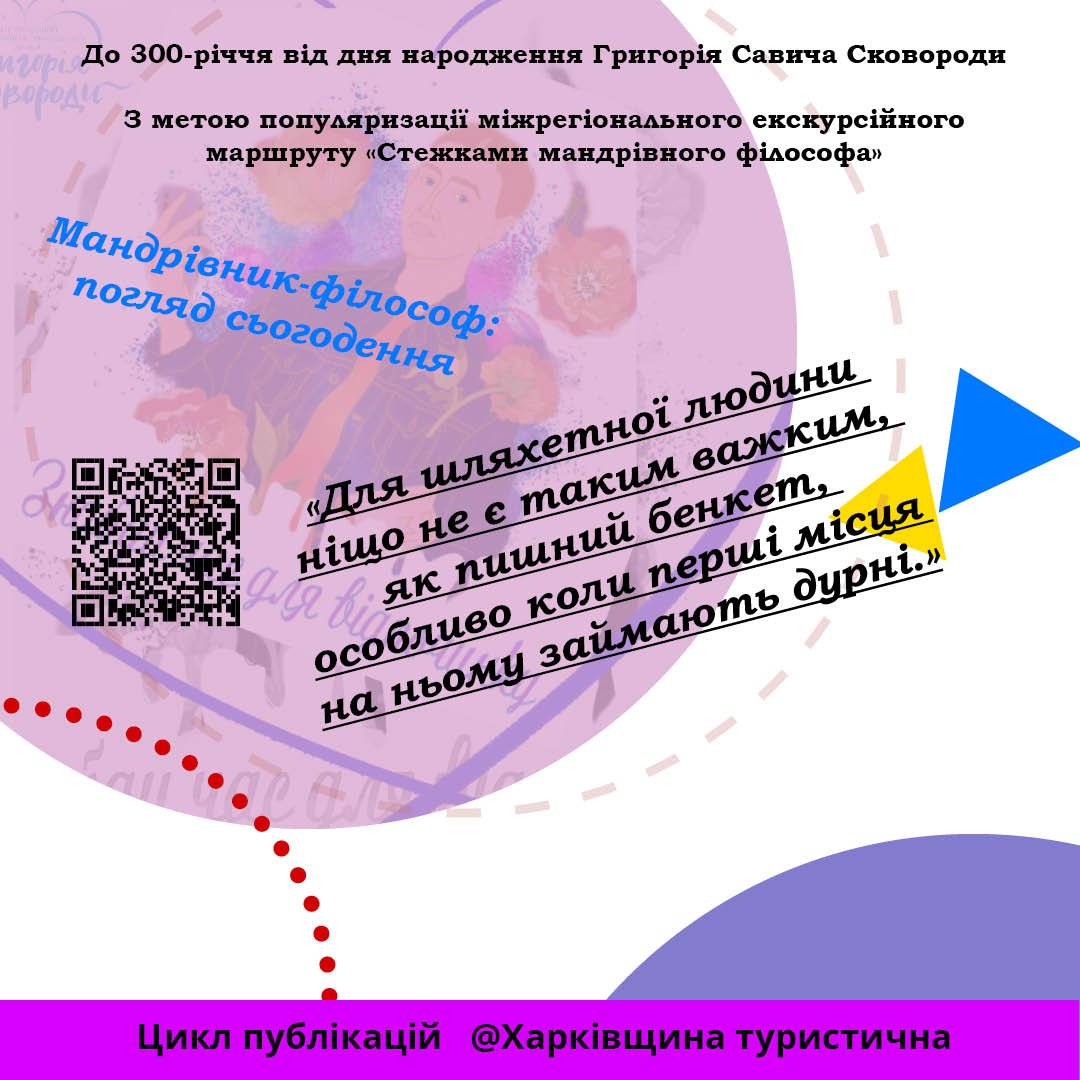 Висловами Сковороди та згадками про об'єкти з маршруту «Стежками мандрівного філософа», які ми ацентуємо вже сьогодні на ілюстраціях, спонукаємо всіх до роздумів. Адже кожен мандрівник в душі – філософ.