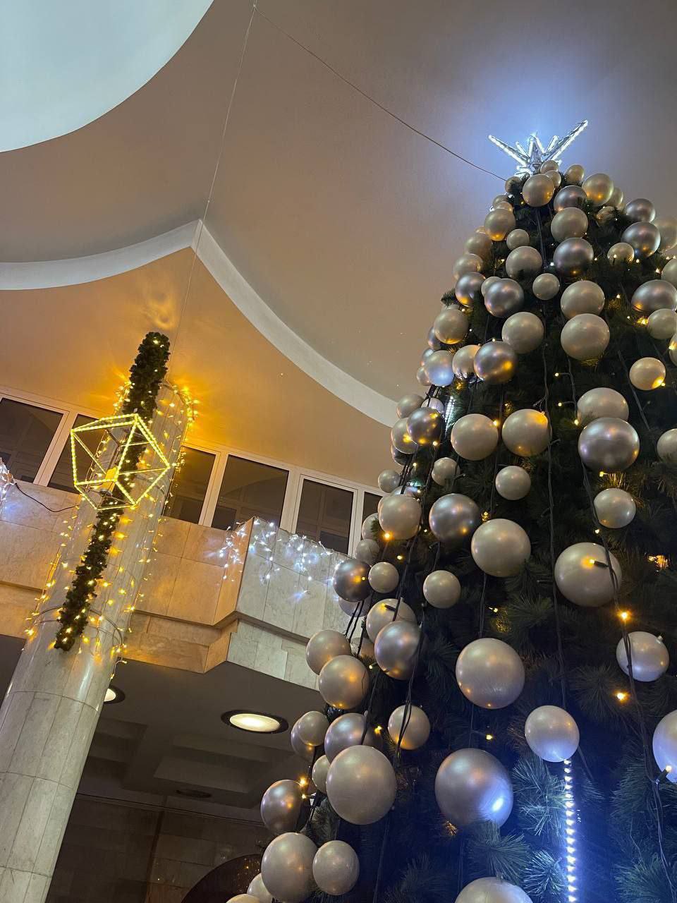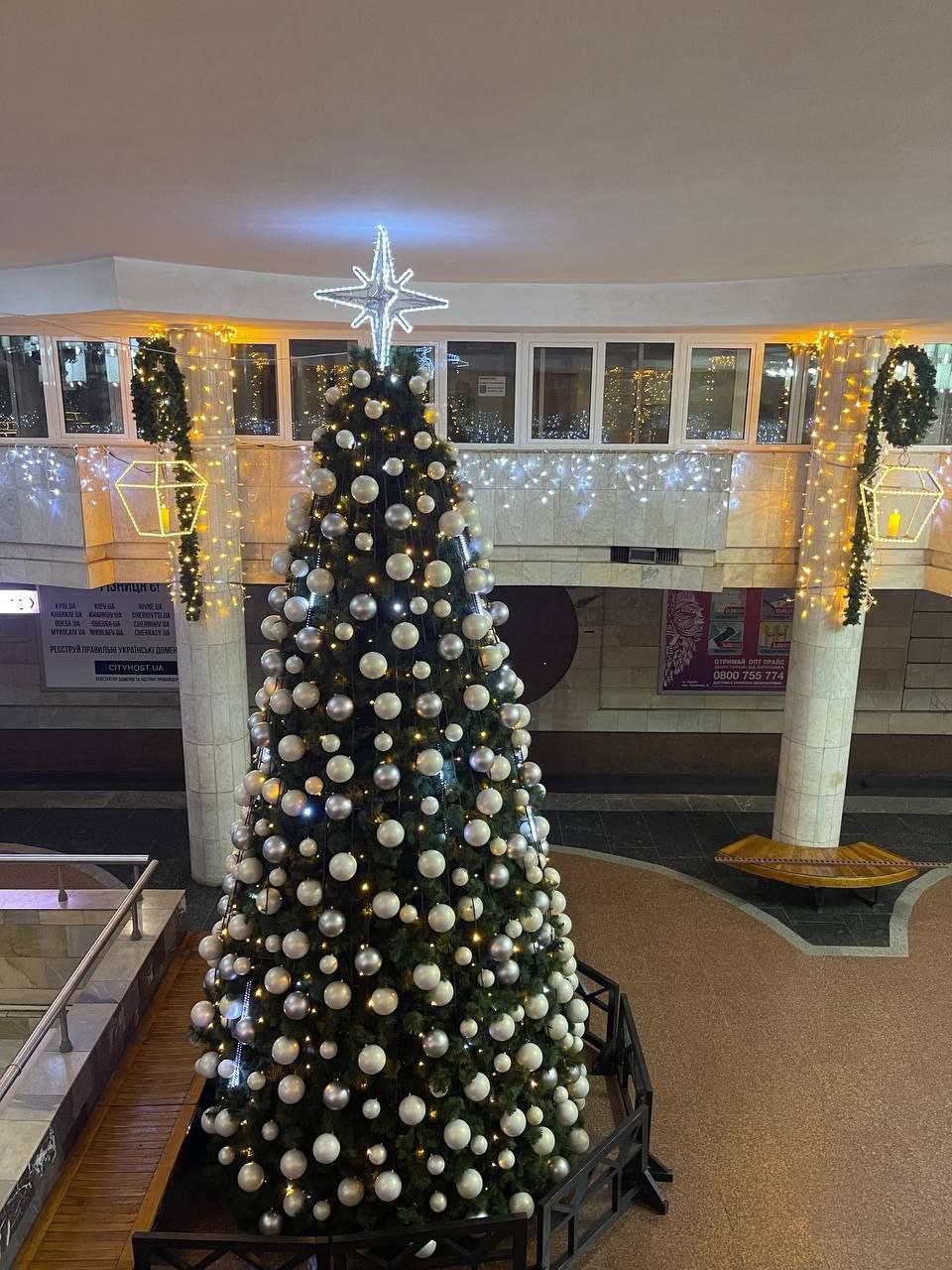 Висота ялинки в метро - 55 метра. Поруч із нею встановили святкові новорічні інсталяції, усю станцію задекорували святковими гірляндами.