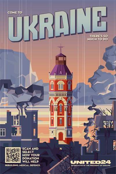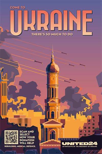 Вінтажна туристична реклама, створена українським ілюстратором Антоніо Фірсіком, запрошує людей відвідати Харків, Київ та Маріуполь. При детальному перегляді, окрім історичних будівель та туристичних місць, глядачі помічають ракети та спустошення, які завдає війна.