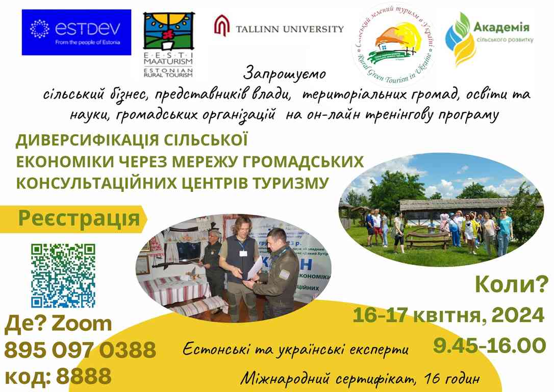 Запрошуємо 16-17 квітня долучитися до тренінгової програми «Диверсифікація сільської економіки через мережу громадських консультаційних центрів туризму» в онлайн-форматі.