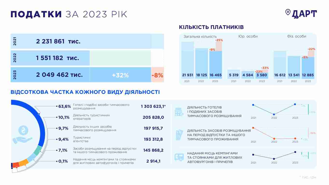 Найбільша частка надходжень до держбюджету за минулий рік – 64 % сплачена готелями – 1 млрд 303 млн 623 тис. грн. Ця сума більша майже вдвічі ніж та, яку представники готельної галузі сплатили в бюджет у 2022 році (898 млн 381 тис. грн) і майже аналогічна тій, яка була сплачена готелями у 2021 році (1 млрд 288 млн 616 тис. грн).