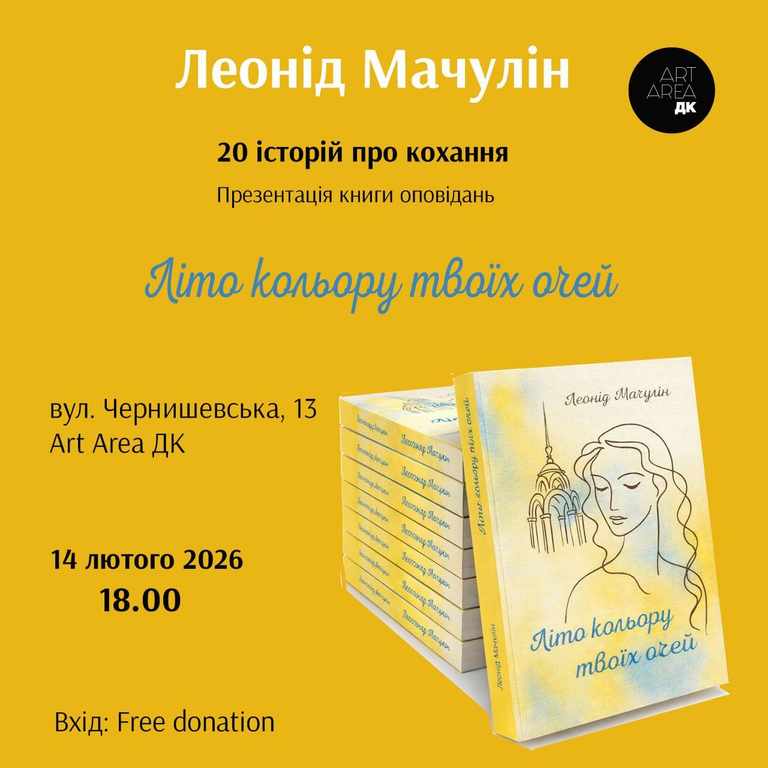 Друзі, запрошуємо 14 лютого 2026 р. о 18:00 до Art Area ДК (м. Харків, вул. Чернишевська, 13) на презентацію збірки оповідань «Літо кольору твоїх очей» Леоніда Мачуліна. Вхід – free donation.