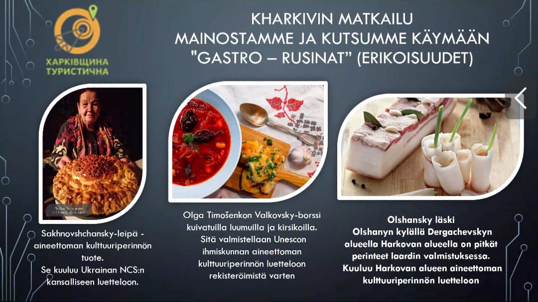 А потім прийшов час Харківщина туристична розповісти для наших фінських друзів про Харківщину, чим вона багата, чим може зацікавити туриста і чому сюди варто колись обов'язково приїхати. Було представлено популярні екскурсійні маршрути, цікаві локації, презентовано театральний і музейний простір, гастрономічні «родзинки» та народні ремесла. Відбулася і відеомандрівка до Меморіальної садиби-музею Рєпіних у м. Чугуїв, яку провела заступник директора ОКЗ «Художньо-меморіальний музей І. Ю. Рєпіна» Ольга Шевченко. Чому саме про Чугуївщину? Бо ім'я художника вписано як в історію України, так і в історію Фінляндії. Майже на 30 років фінська земля була для Іллі Юхимовича Рєпіна домівкою, там він знайшов свій вічний упокій. І саме цей факт викликав у аудиторії найбурхливіші емоції. Ані екрани комп’ютерів, ані відстань однієї країни від іншої, ані мовний бар’єр – ніщо не заважило нам у цю мить відчувати спорідненість та справдішній інтерес один до одного.