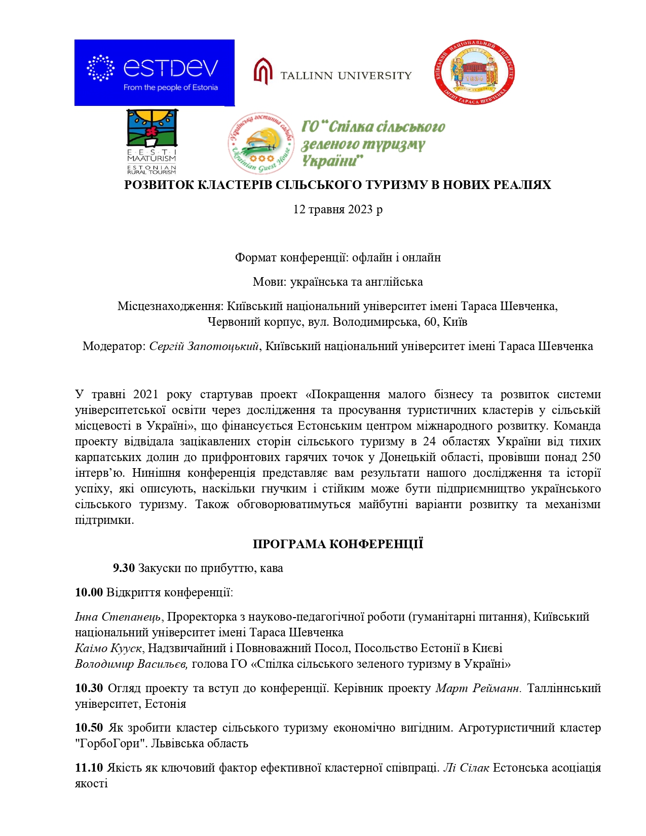 У травні 2021 року стартував проєкт «Покращення малого бізнесу та розвиток системи університетської освіти через дослідження та просування туристичних кластерів у сільській місцевості в Україні», що фінансується Естонським центром міжнародного розвитку. Команда проєкту протягом цього часу відвідала зацікавлені локації сільського туризму в 24 областях України: від тихих карпатських долин до прифронтових гарячих точок у східних областях України, провівши понад 250 інтерв’ю.