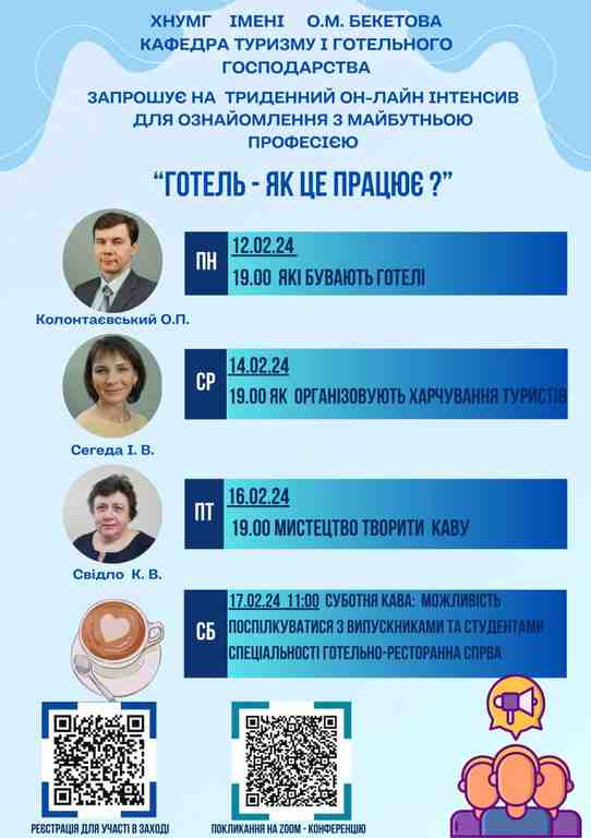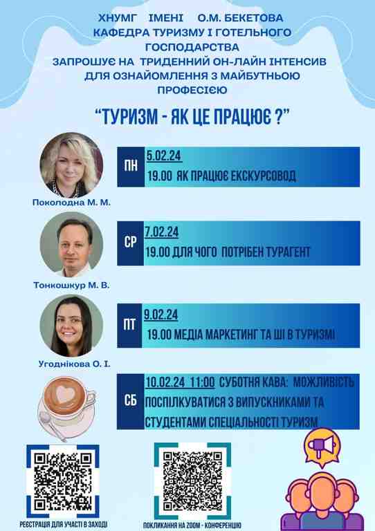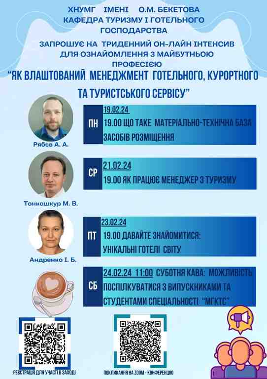 ЗАПРОШУЄМО до участі у лютневих онлайн-інтенсивах, які організовує Кафедра туризму і готельного господарства ХНУМГ імені О. М. Бекетова, за наступними темами: