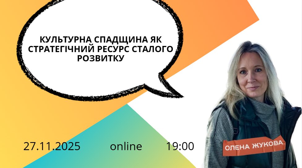 27 листопада 2025 р. о 19:00 відбудеться науковий семінар «Культурна спадщина як стратегічний ресурс сталого розвитку». Під час події йтиметься про індикатори впливу спадщини на розвиток територій, інтеграційні моделі управління та практичні інструменти, що вже працюють у різних країнах.