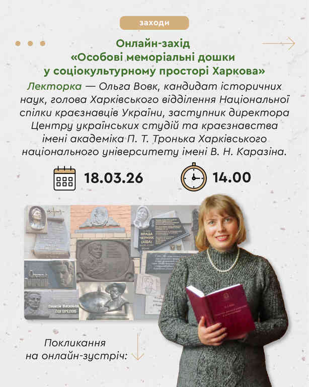 Запрошуємо охочих на онлайн-захід «Особові меморіальні дошки у соціокультурному просторі Харкова», що відбудеться 18 березня 2026 р., початок о 14:00.