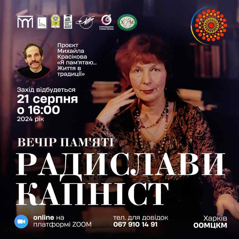 Запрошуємо 21 серпня о 16:00 на онлайн-вечір памʼяті РАДИСЛАВИ КАПНІСТ, що відбудеться в межах проєкту Михайла Красікова «Я памʼятаю… Життя в традиції» на платформі Zoom.