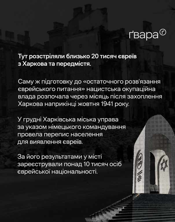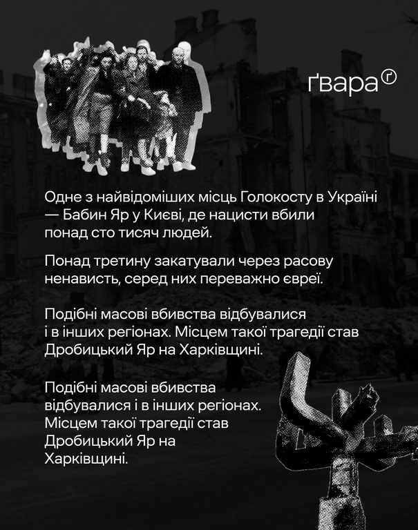 Для Харкова цей день відгукується Дробицьким Яром, де під час нацистської окупації було страчено від 16 до 20 тисяч людей. Більшість із них – євреї.